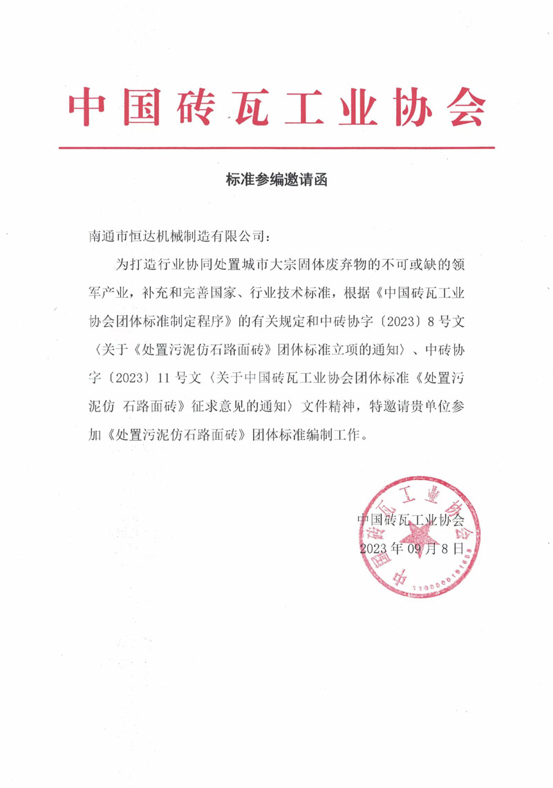 行業(yè)要健康發(fā)展,標(biāo)準(zhǔn)必須先行。再此背景下,2023年10月21-22日,在中國杭州,中國磚瓦協(xié)會(huì)及時(shí)的組織了行業(yè)骨干企業(yè),群策群力,制定高質(zhì)量標(biāo)準(zhǔn)。南通市恒達(dá)機(jī)械制造有限公司董事長崔恒全和技術(shù)總工于銀龍受邀請參加,為標(biāo)注的制定貢獻(xiàn)恒達(dá)力量。